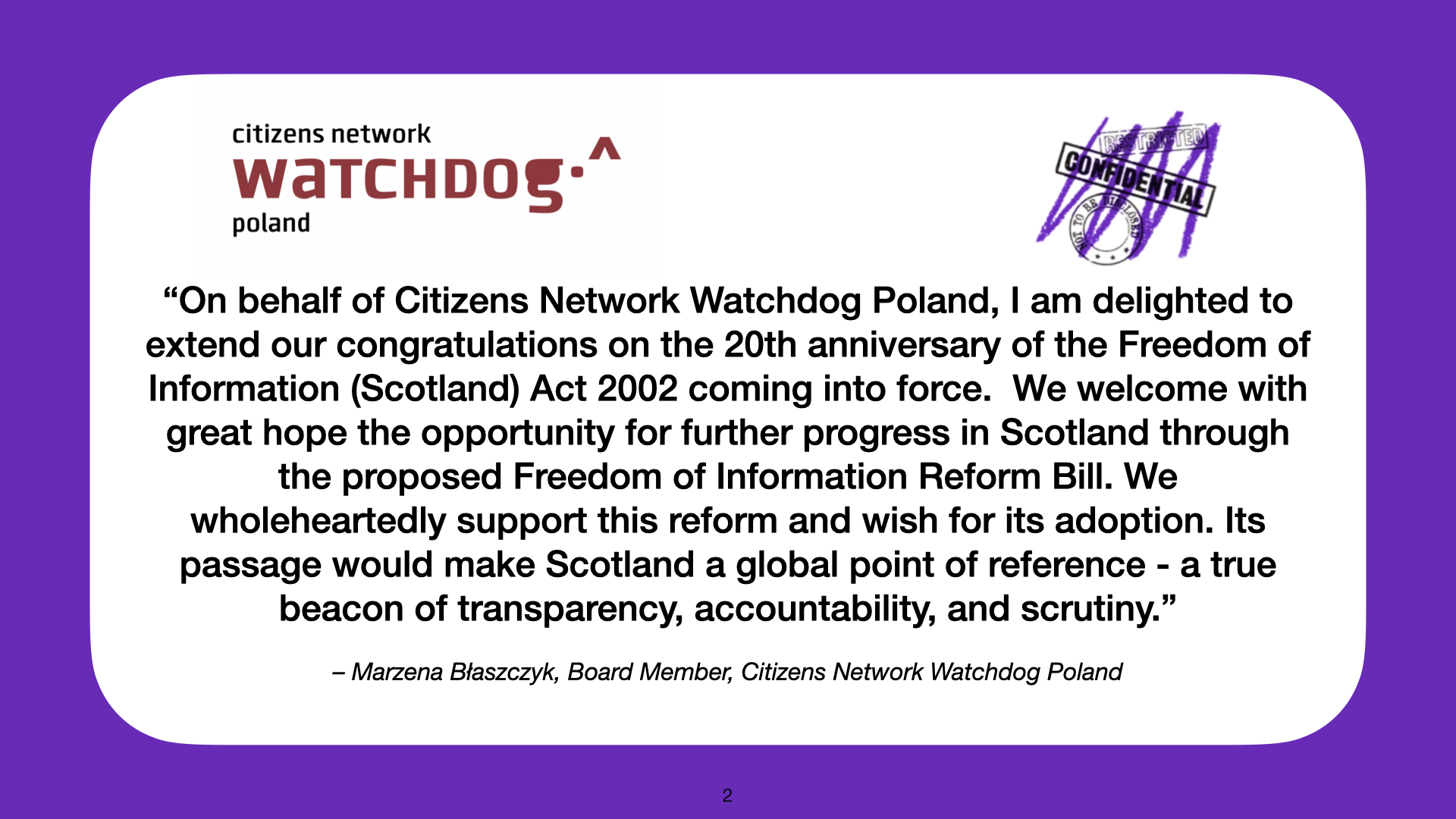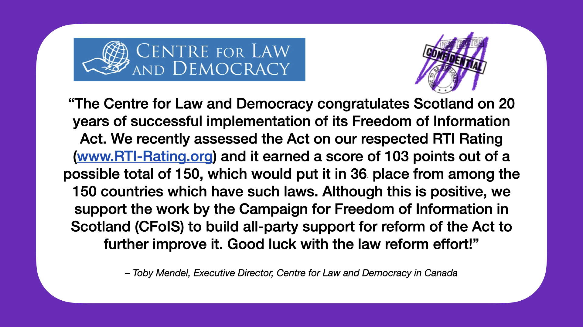 “Finalising the detail of my member’s Bill is progressing well. I have had a meeting with the Parliamentary clerks who have provided feedback on the sections and accompanying documents. I appreciate the helpful comments that have been provided by CFoIS, Dr Sean Whittaker from the Centre for FoI at Dundee University and Rachel Hanna from Access Info Europe. I have also spoken with members of the legal profession to discuss the implications of the draft Bill. It is not a simple process and we are clear that only so much can be achieved from a member’s Bill especially when trying to address the FoI deficit caused by the decades of fragmentation in public service delivery providers across Scotland.