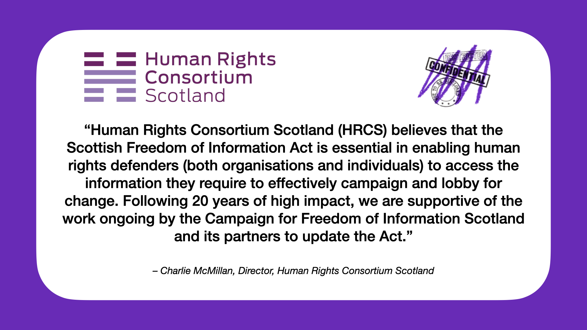 Event: CFoIS to hold FoISA Reform Bill Update with Human Rights Consortium Scotland You are invited to the CFoIS update event on the Freedom of Information Reform (Scotland) Bill and its progress through Stage 1, which will be held in conjunction with Human Rights Consortium Scotland.