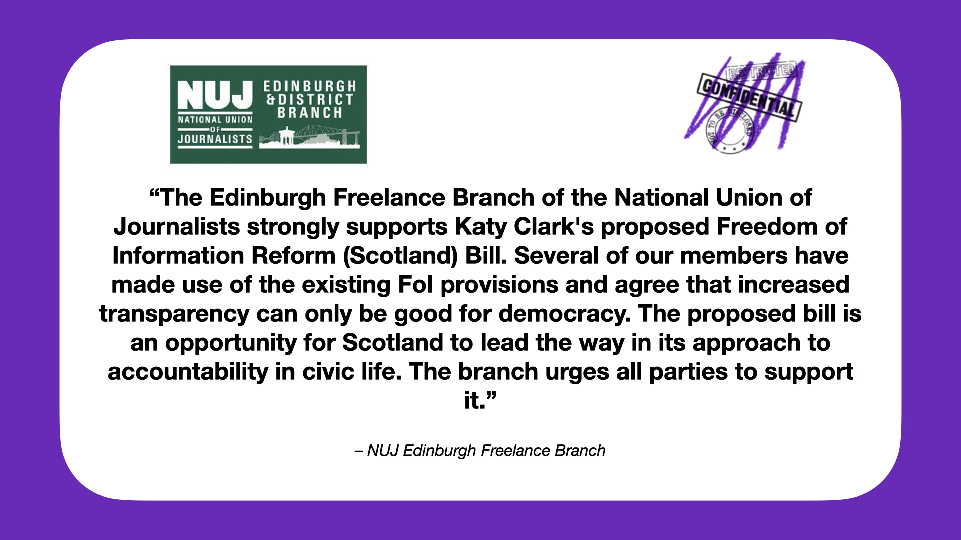 “When I was given permission to progress a member’s Bill, the MSPs supporting my Bill were listed on the Scottish Parliament website and although more MSPs have indicated their support subsequently, their names can no longer be added to that published list. However I look forward to receiving their support when I publish my FoI Reform Bill soon and I look forward to the subsequent cross party debate at Stage 1.
